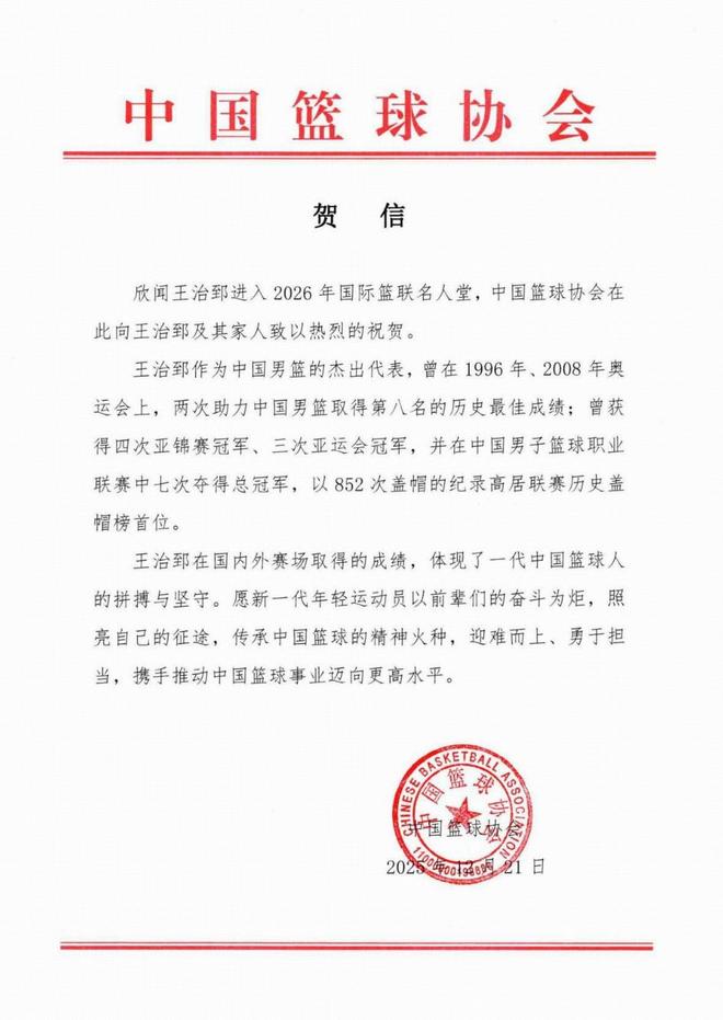 欣聞王治郅進入2026年國際籃聯名人堂,中國籃球協會在此向王治郅及其家人致以熱烈的祝賀。