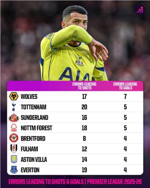 根據統計,到目前為止,在本賽季的英超聯賽中,熱刺已經出現了5次導致對方進球的失誤,僅次於狼隊的7次。熱刺還在導致對方射門的失誤次數方麵位居聯賽首位,共有20次。